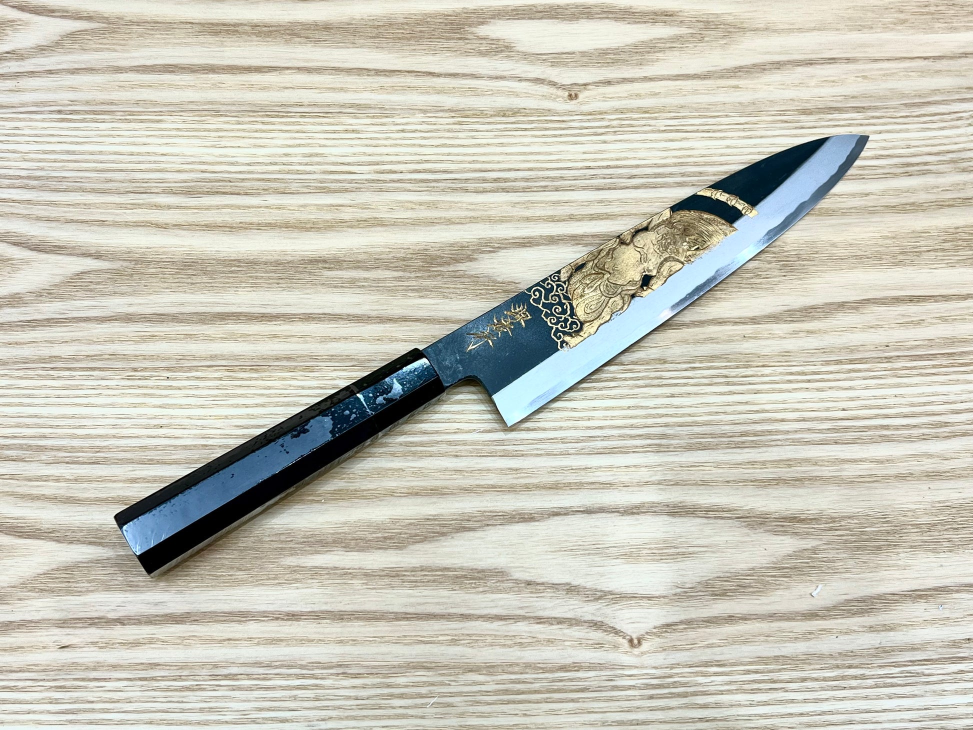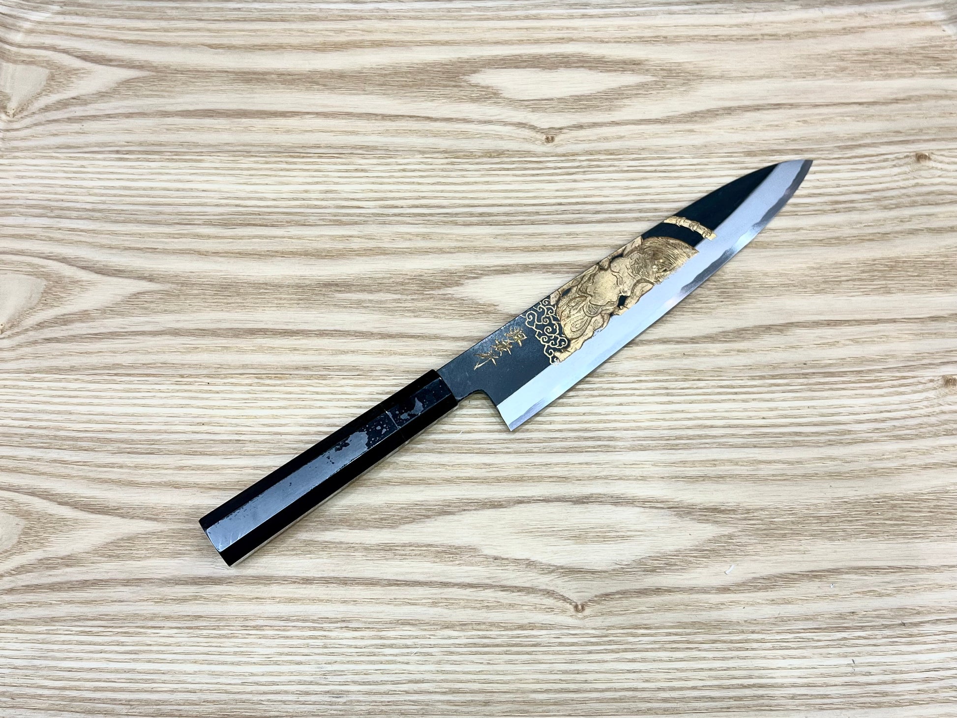 Meticulously hand-engraved by Michiko Kubota of Sakai Takayuki, her distinctive work requires hours of dedication, from initial design to the final product. Each knife is presented in a custom box, which is also hand-personalized by Michiko, showcasing her exceptional attention to detail and craftsmanship.